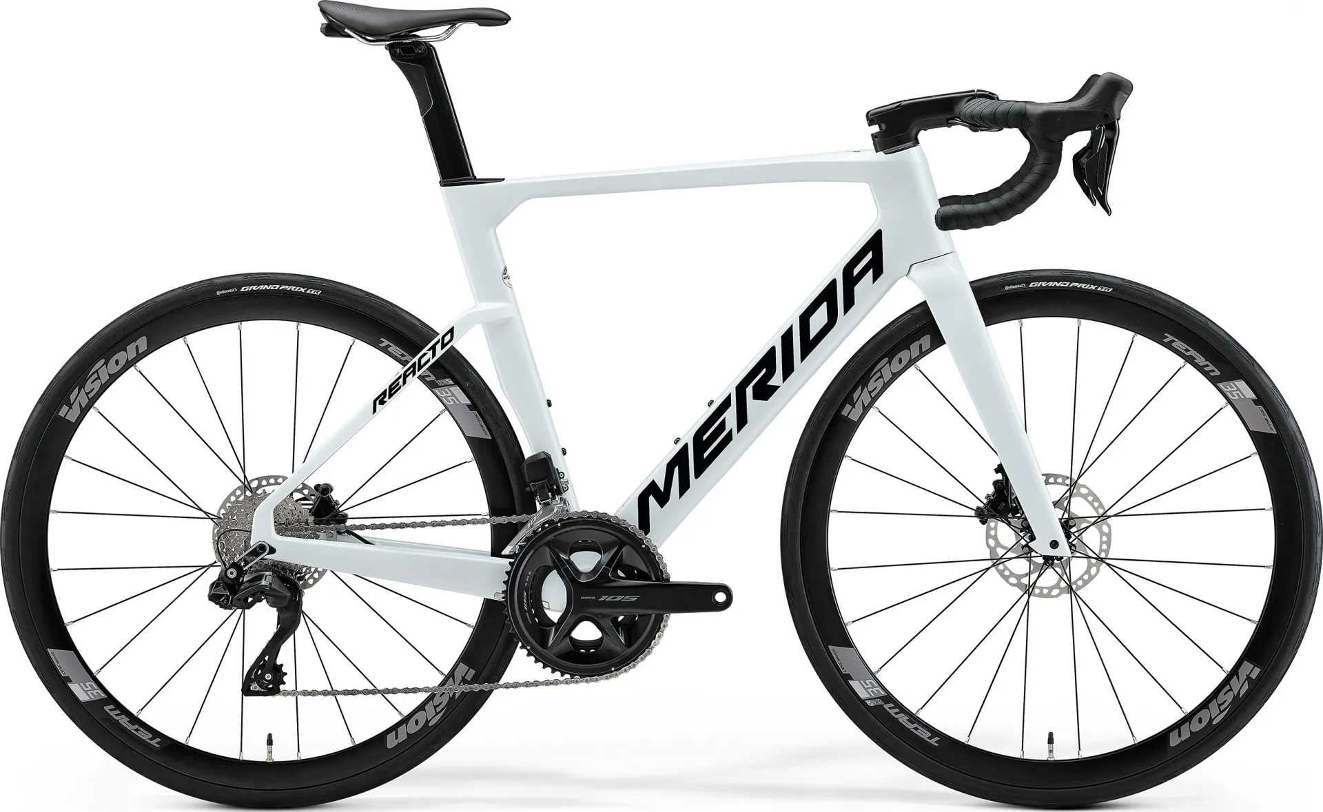 Reacto 5000 — це доступніша версія легендарної Reacto 6000, але з колесами Vision Team 35 Clincher та покришками Continental Grand Prix TR, які ідеально підходять для швидкісної їзди. Комбінація виносу Merida Expert SL та керма Merida Expert CW забезпечує точне керування, а аеропідсідельний штир Merida S-Flex додає комфорту. Велосипед оснащено технологіями Disc cooler та Wire port для естетичної інтеграції кабелів та ефективного охолодження гальм.